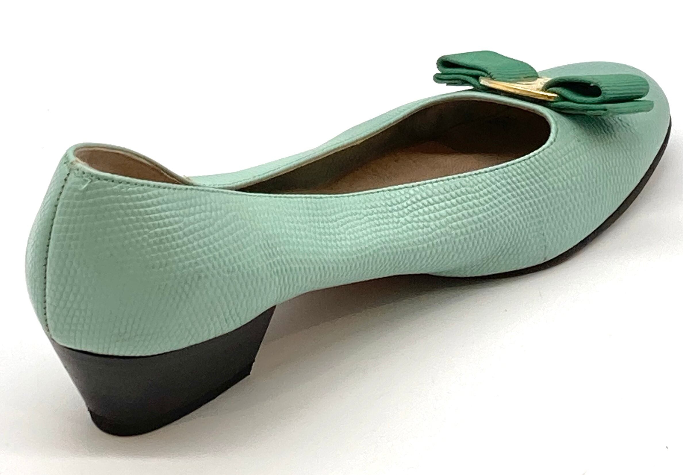 ミントグリーン型押しレザーヴァラリボンパンプス(リボンリカラー)