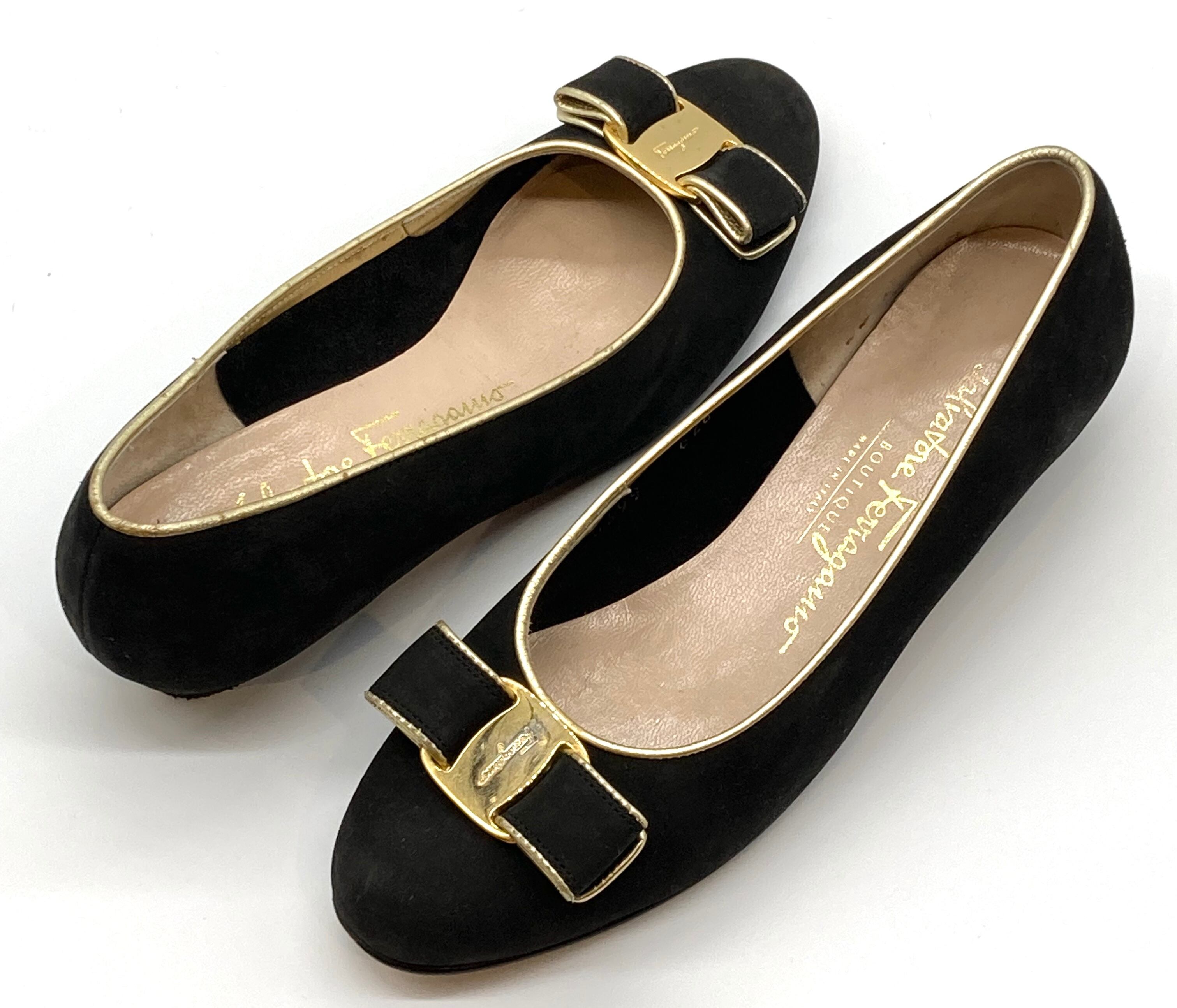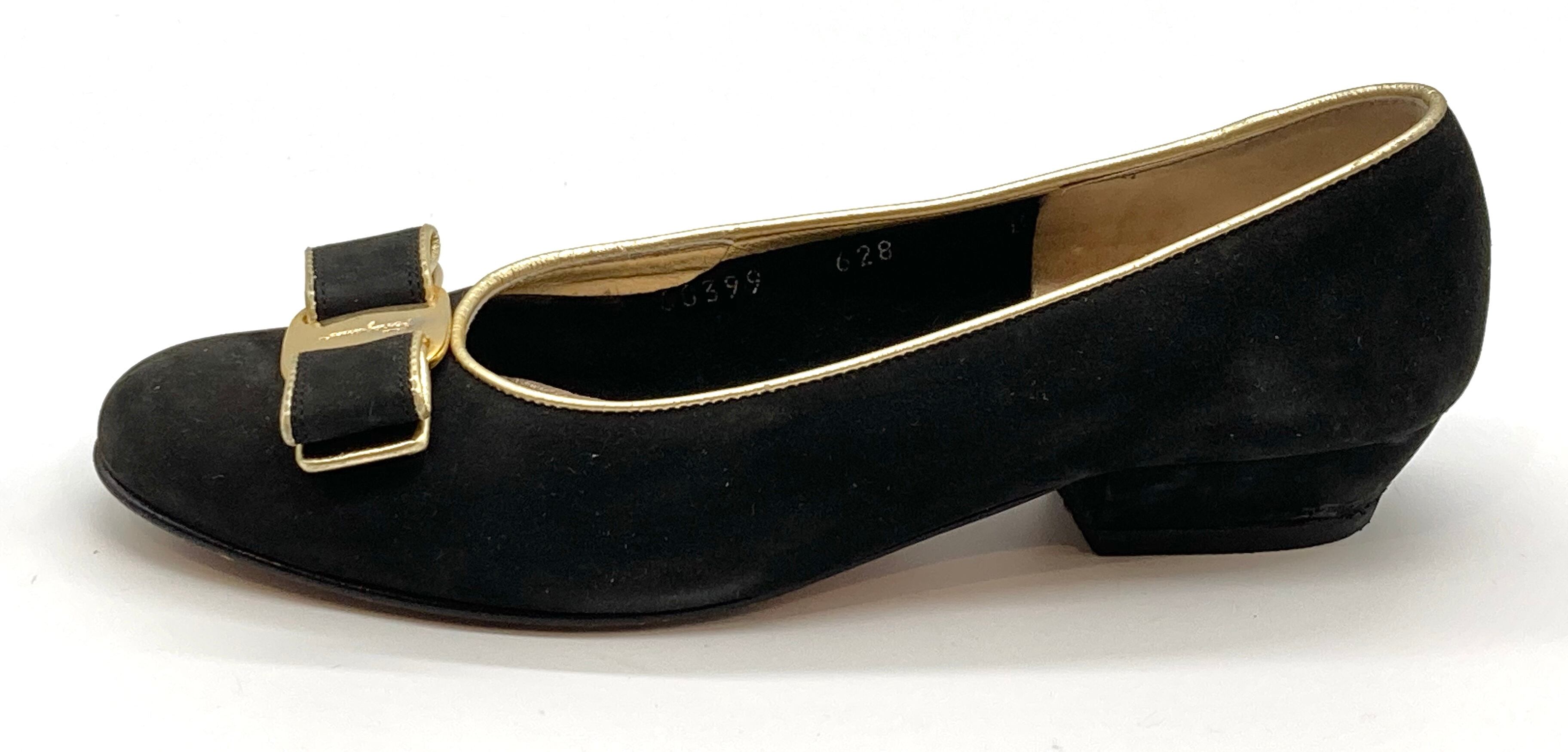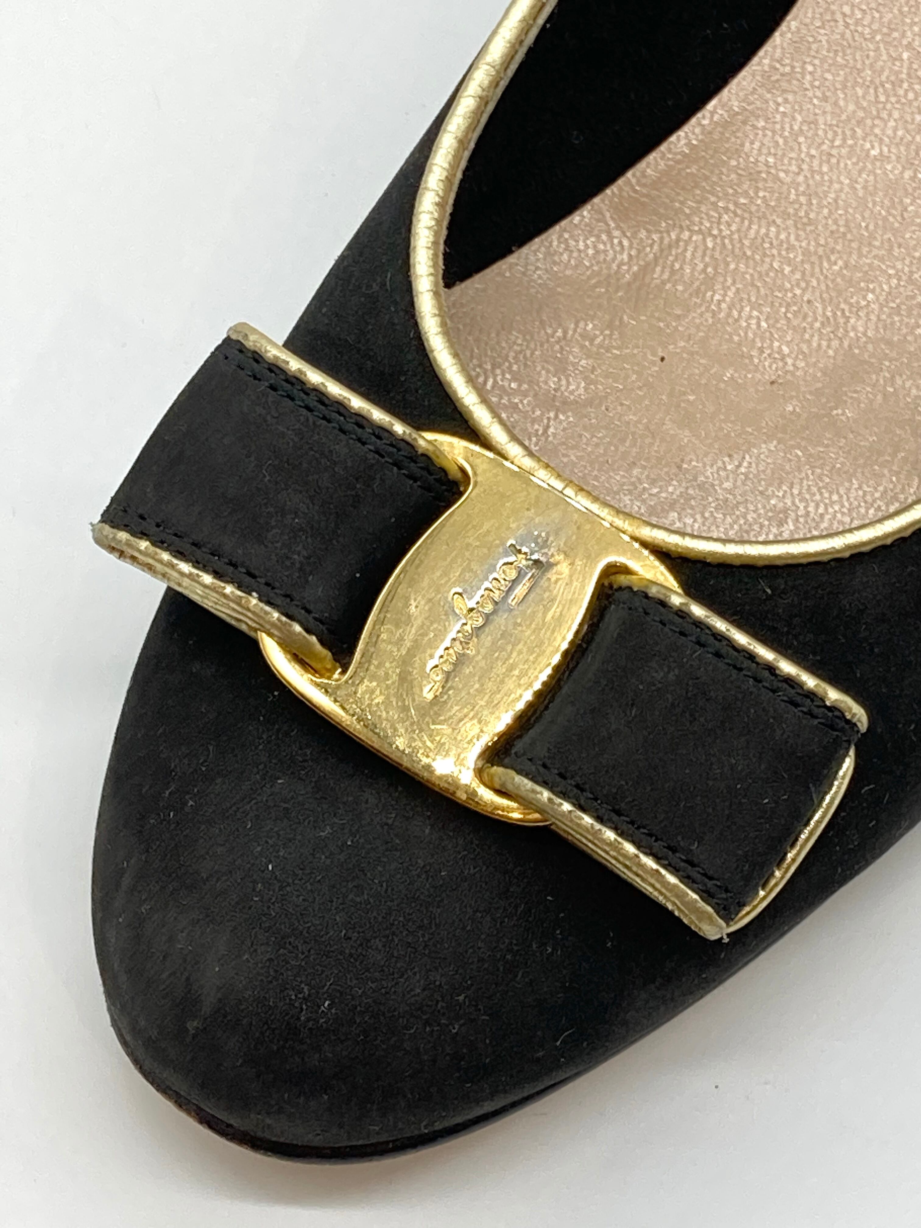 OLD FERRAGAMO(オールドフェラガモ) ブラックスエード×ゴールドパイピングヴァラリボンパンプス 6B