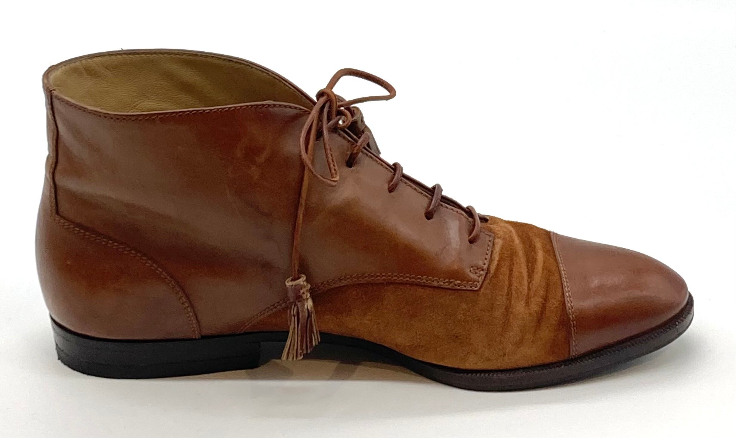 キャメルっぽいライトブラウンのコンビ素材で、人気のレースアップタイプ。