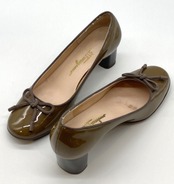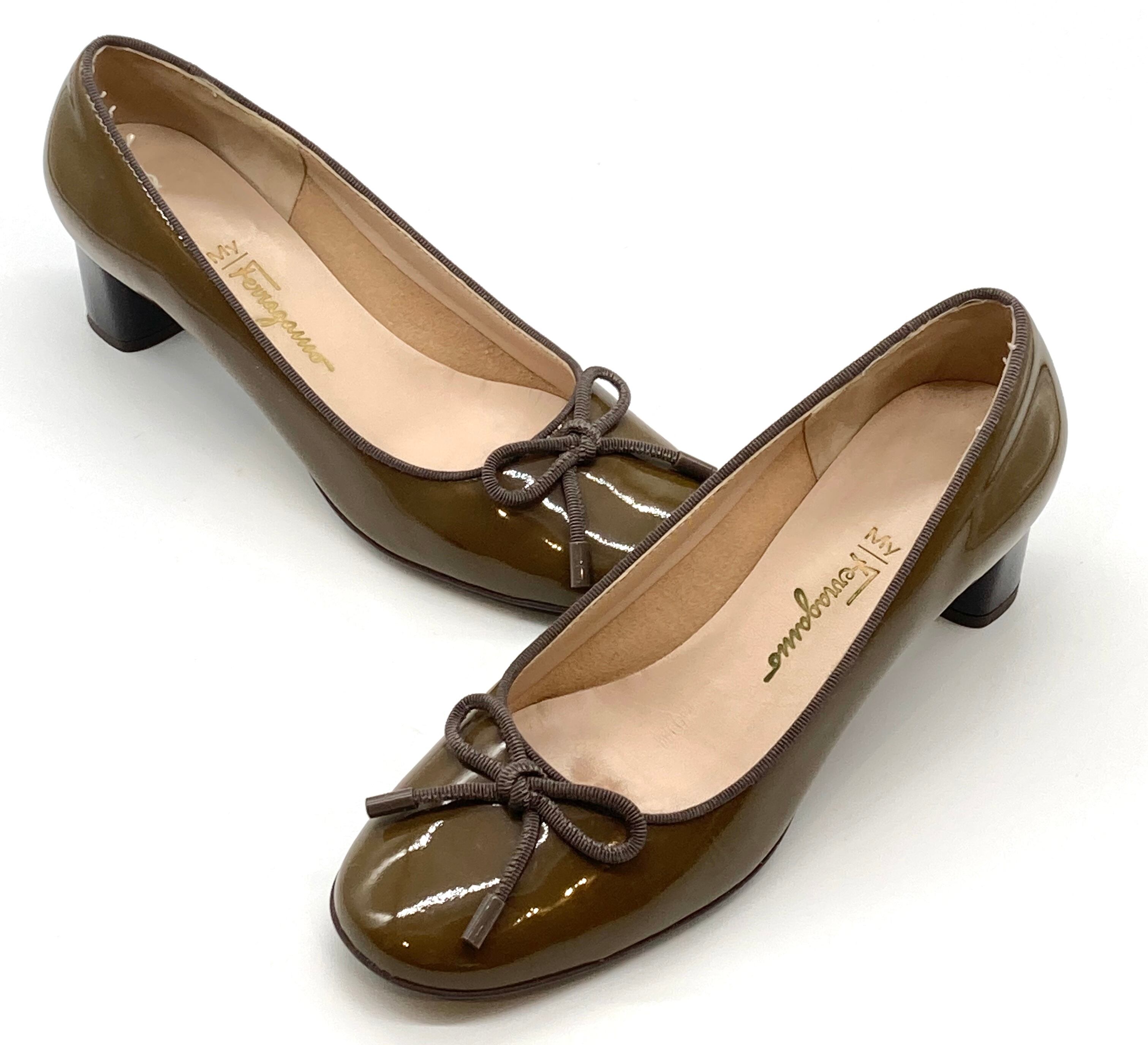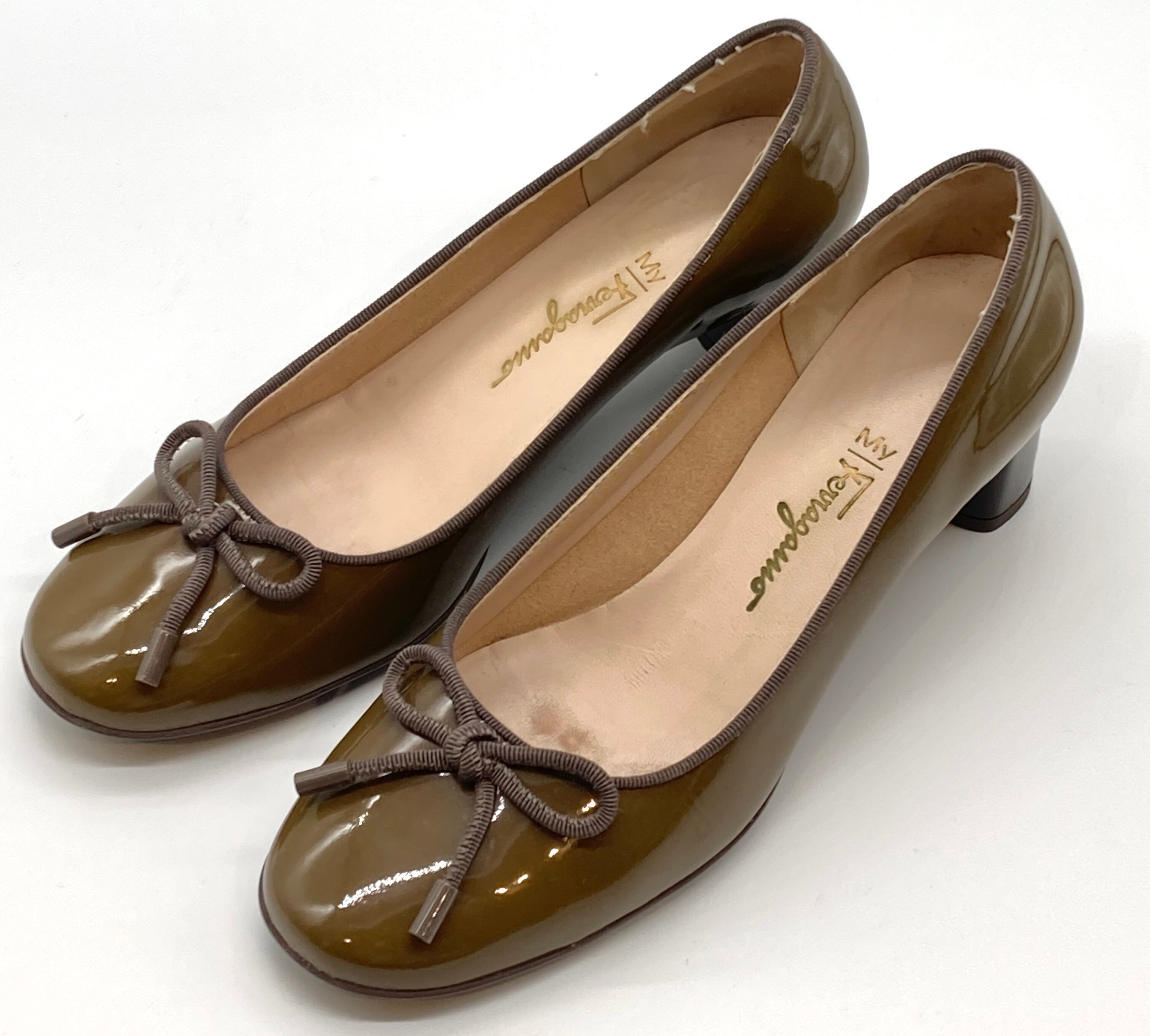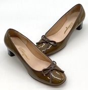 OLD FERRAGAMO(オールドフェラガモ) カーキパテントリボンパンプス 7 1/2C
