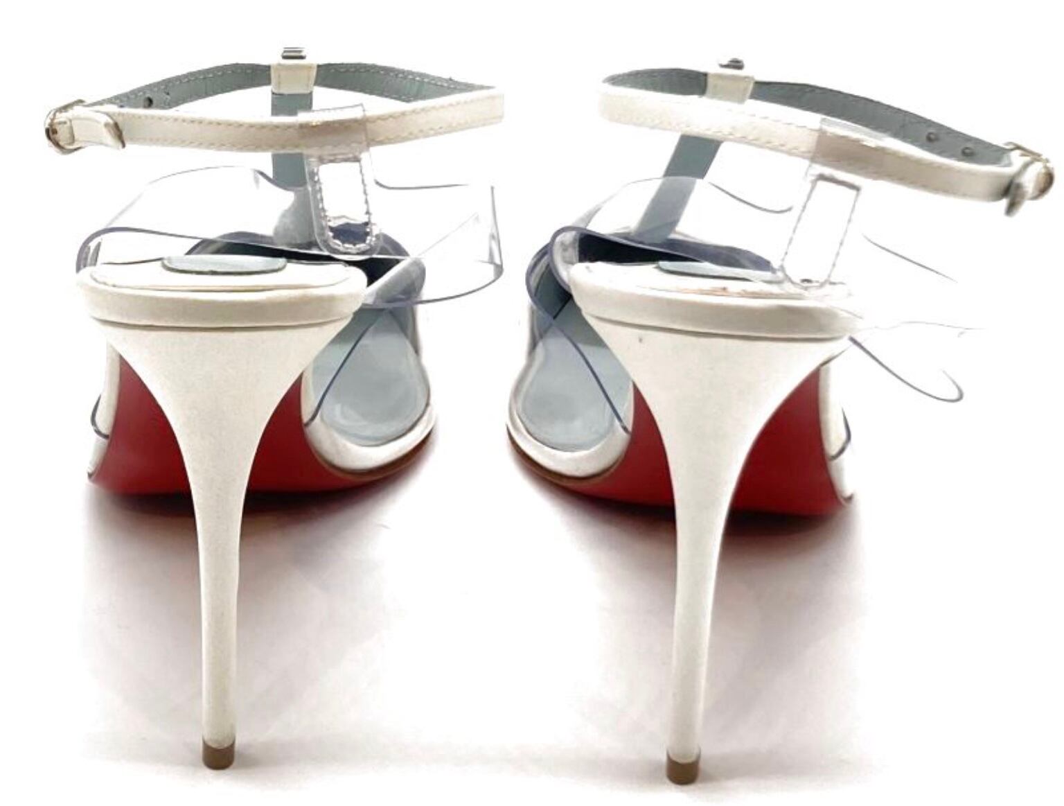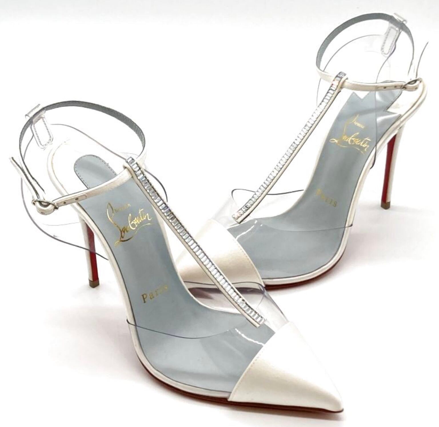 Christian Louboutin(クリスチャンルブタン)ホワイトシルクサテン×ライトブルースワロフスキーTストラップサンダル37