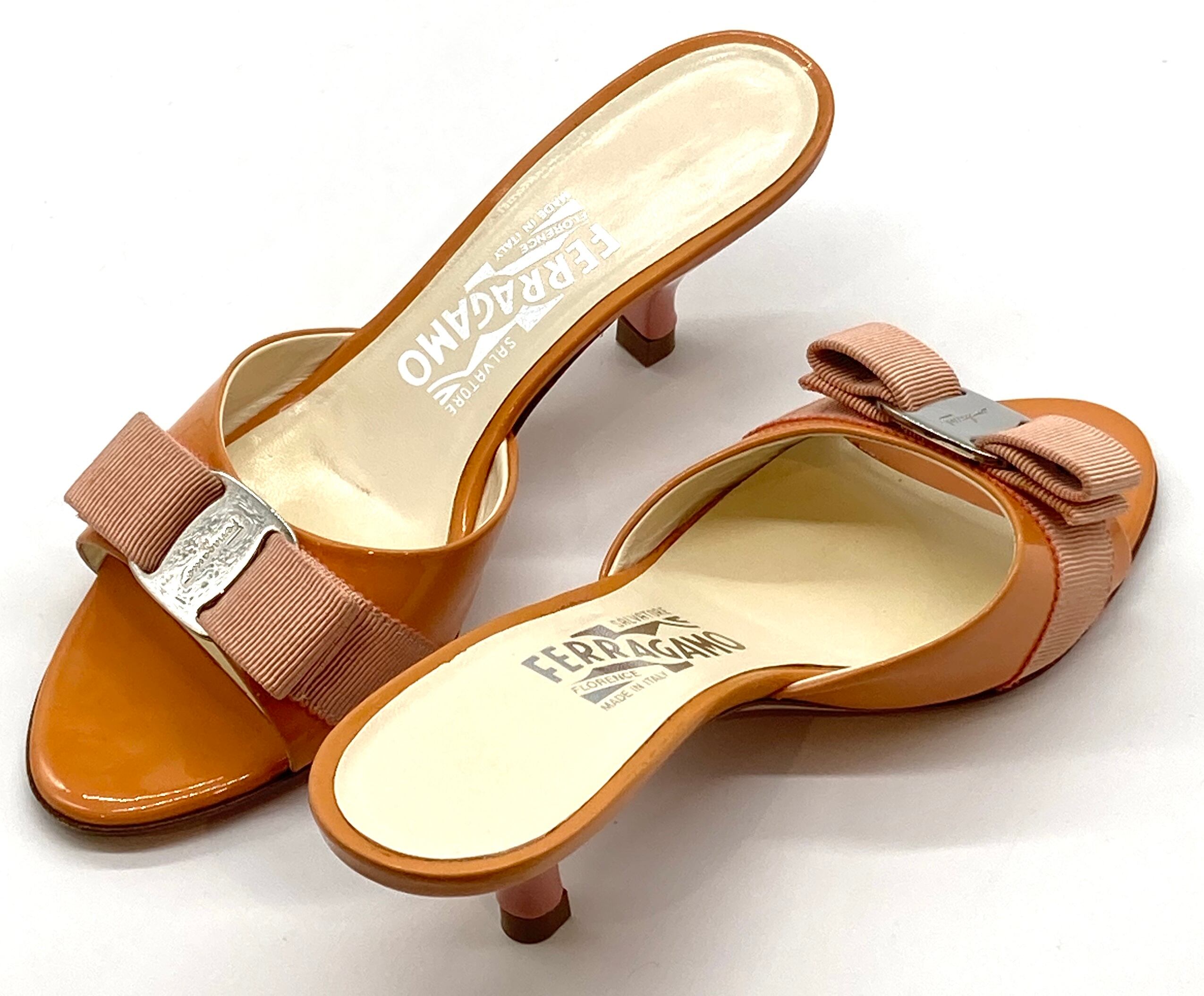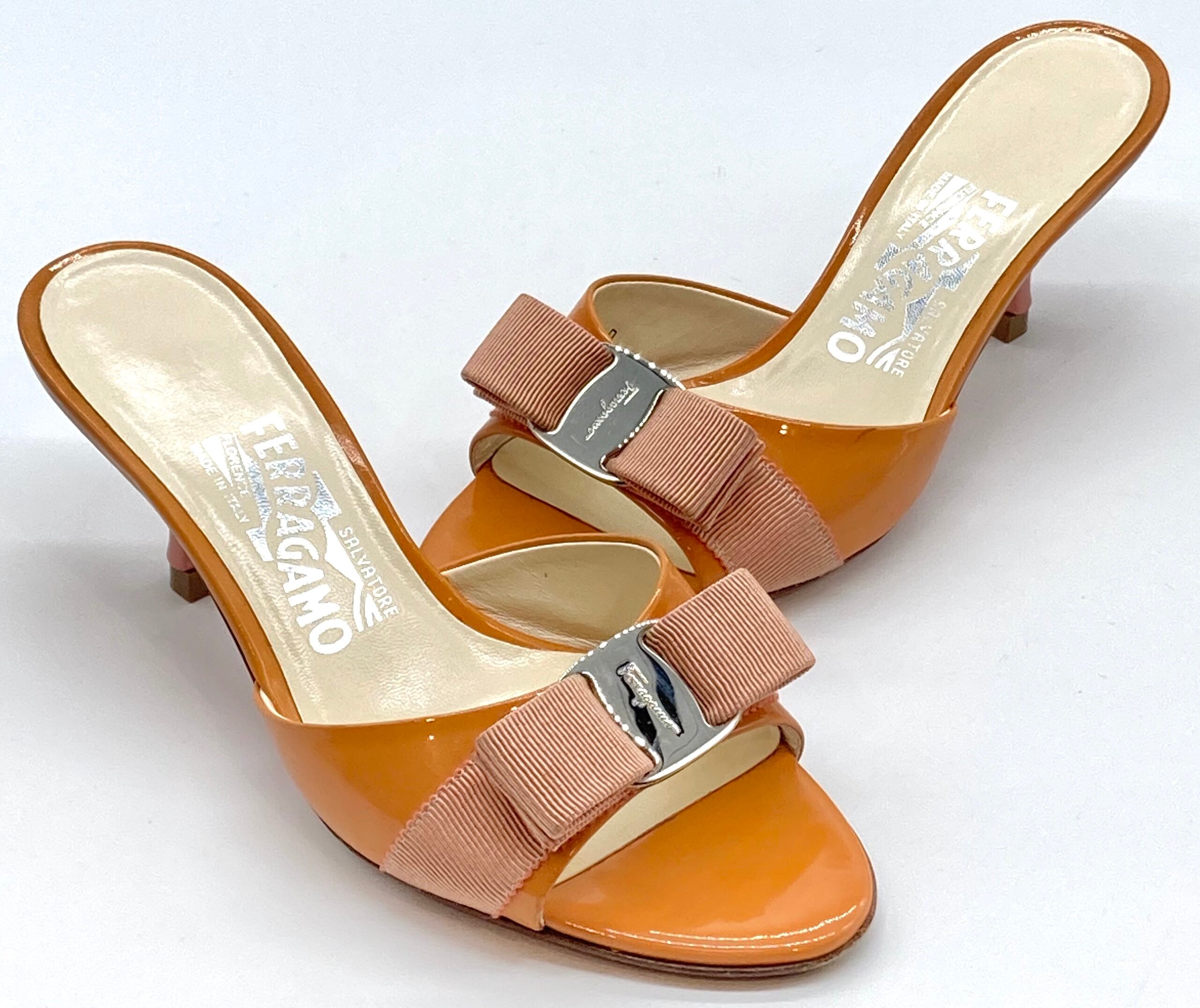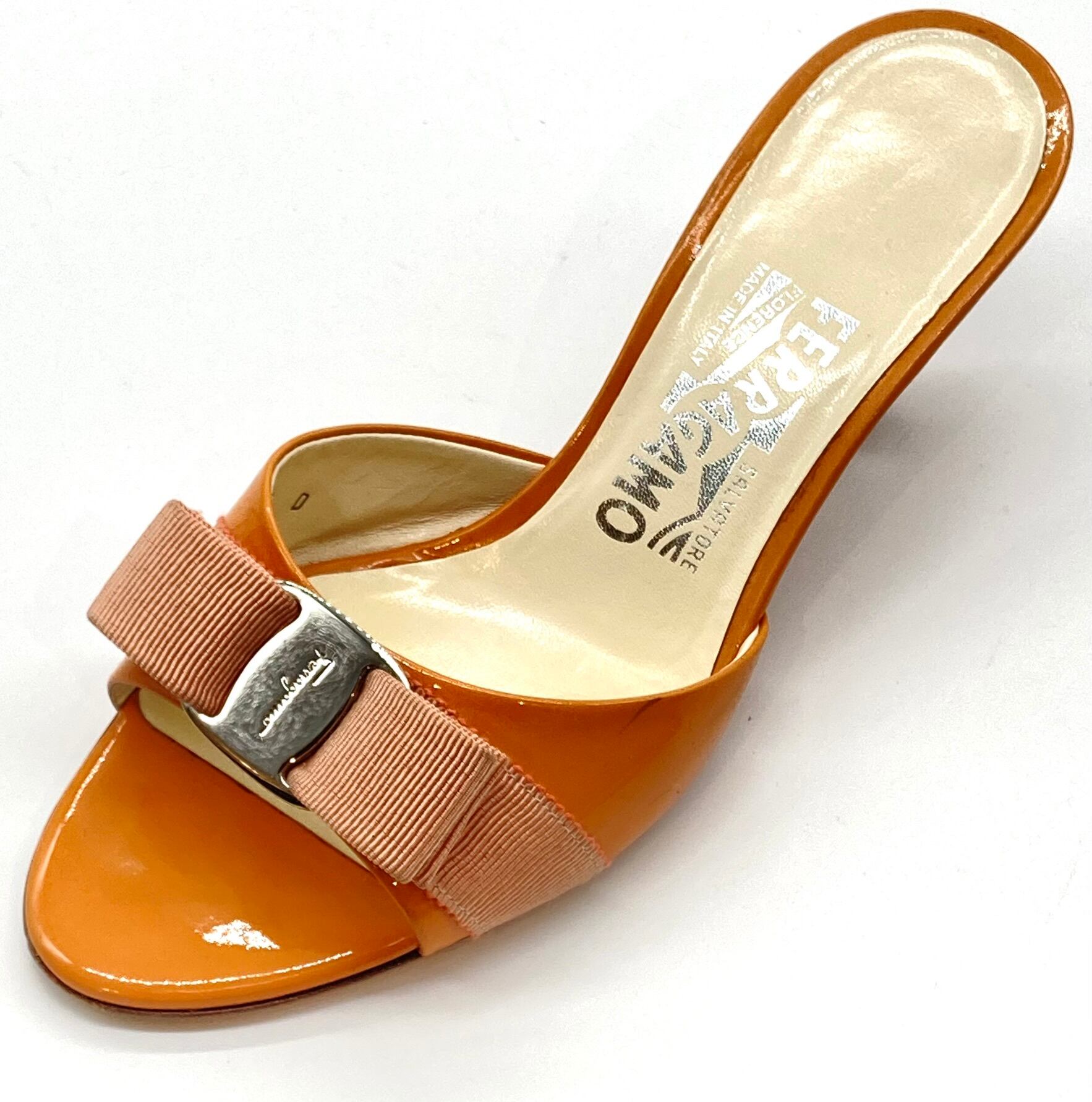 OLD FERRAGAMO(オールドフェラガモ) オレンジ×ピンクパテントヴァラリボンミュールサンダル 5 1/2D