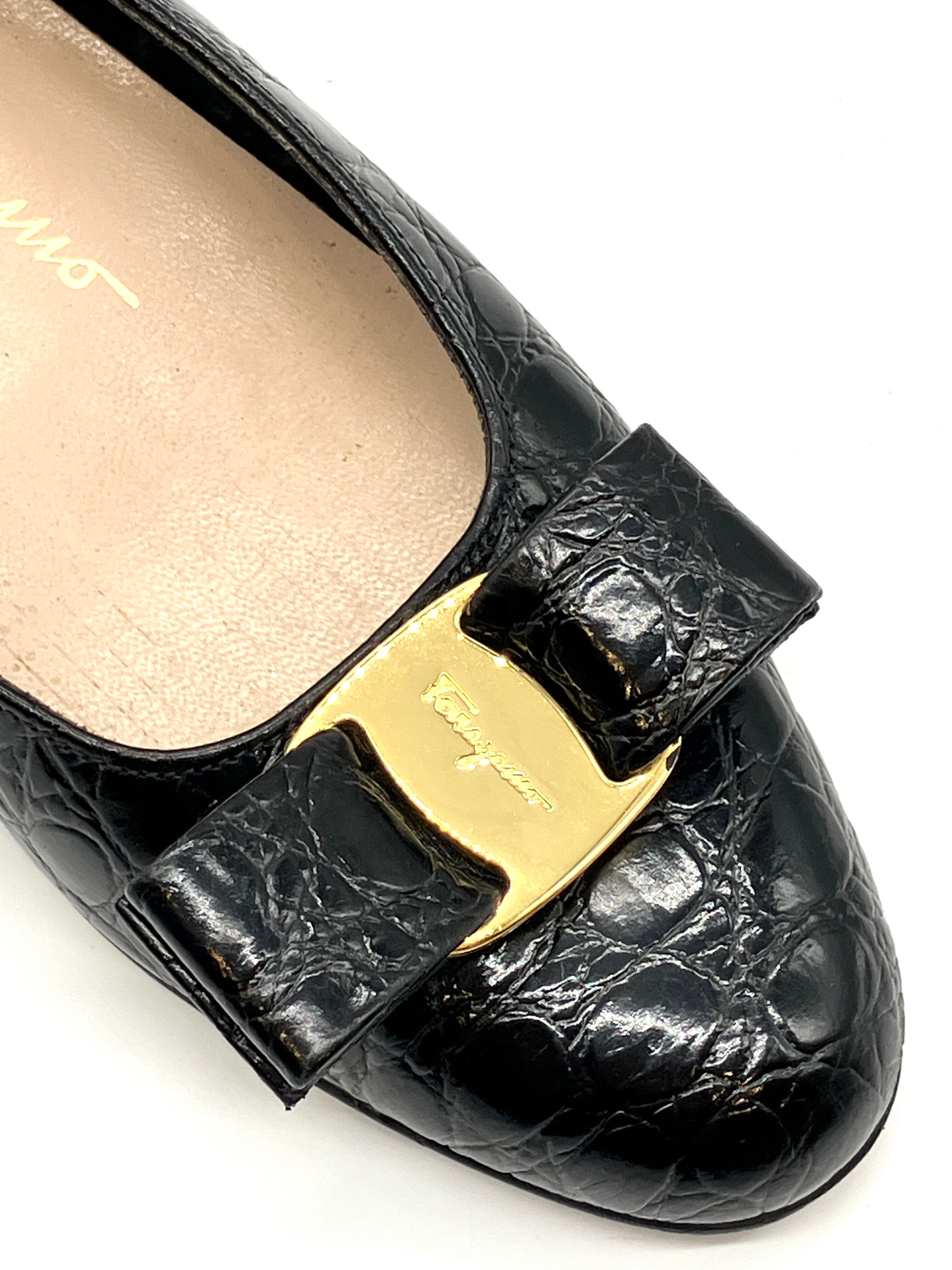 ブラッククロコ型押しレザーヴァラリボンパンプス