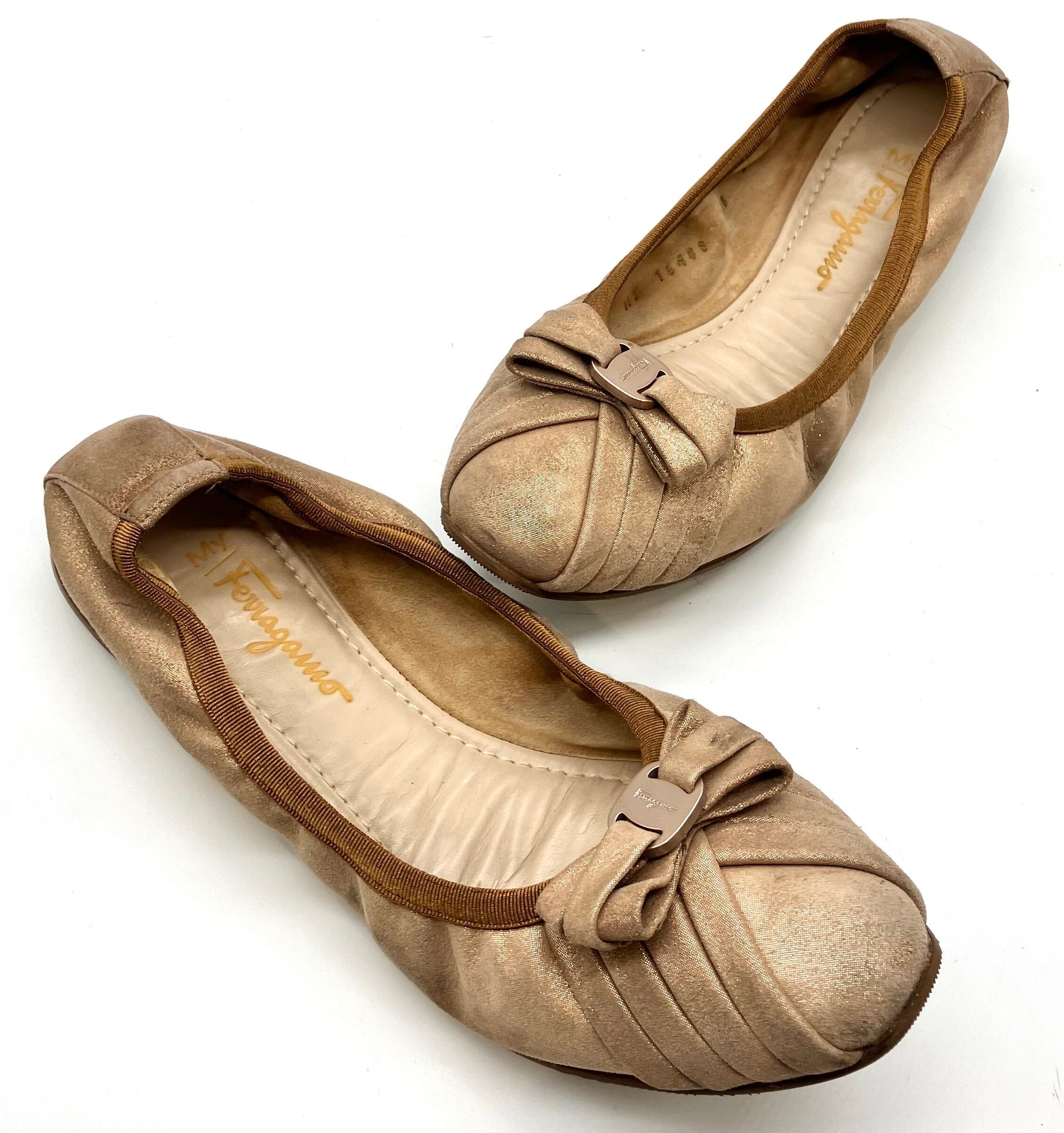 OLD FERRAGAMO(オールドフェラガモ/ヴィンテージ)ピンクゴールドレザーリボンバレエフラットシューズ MYJOY 5 1/2M