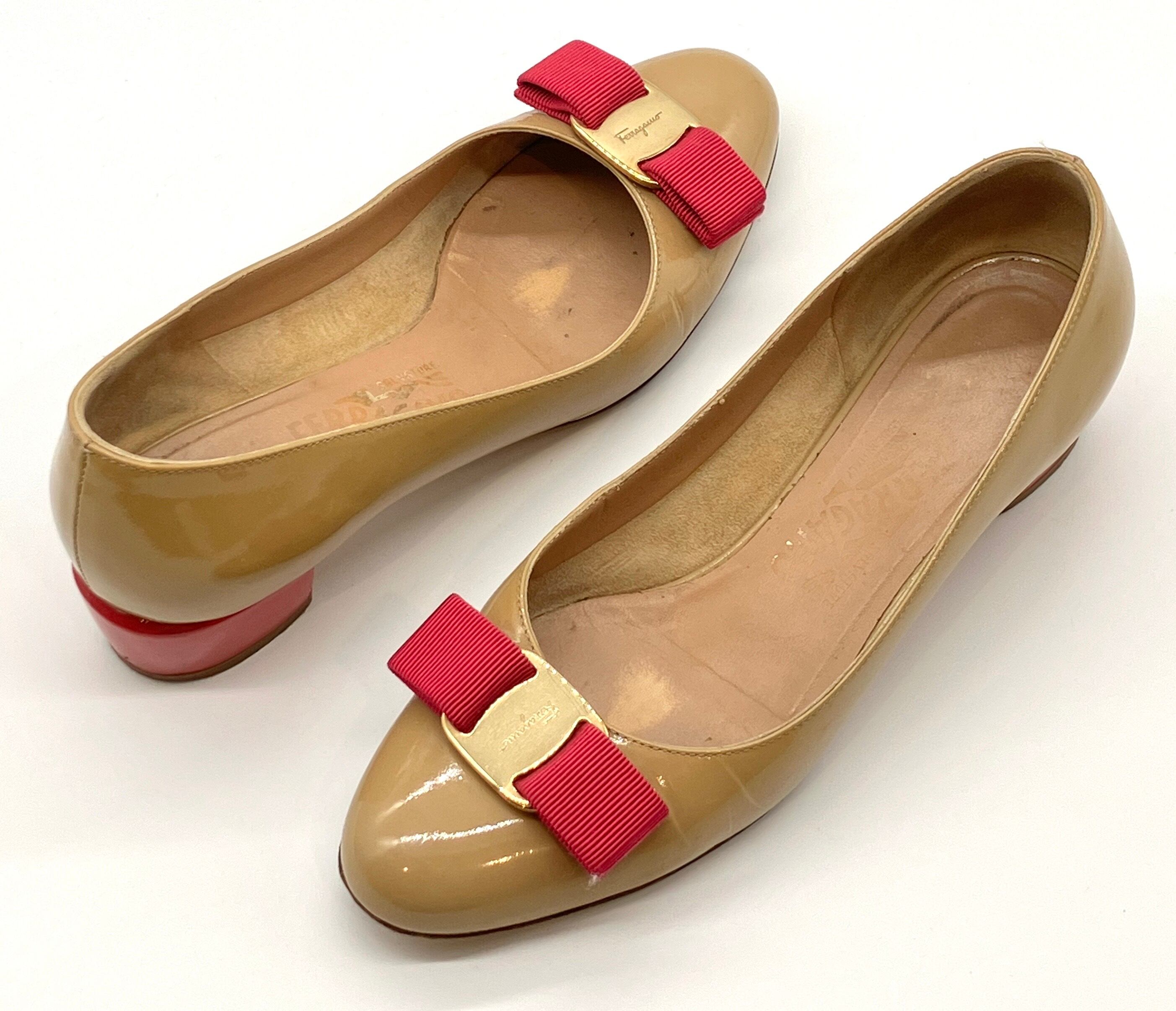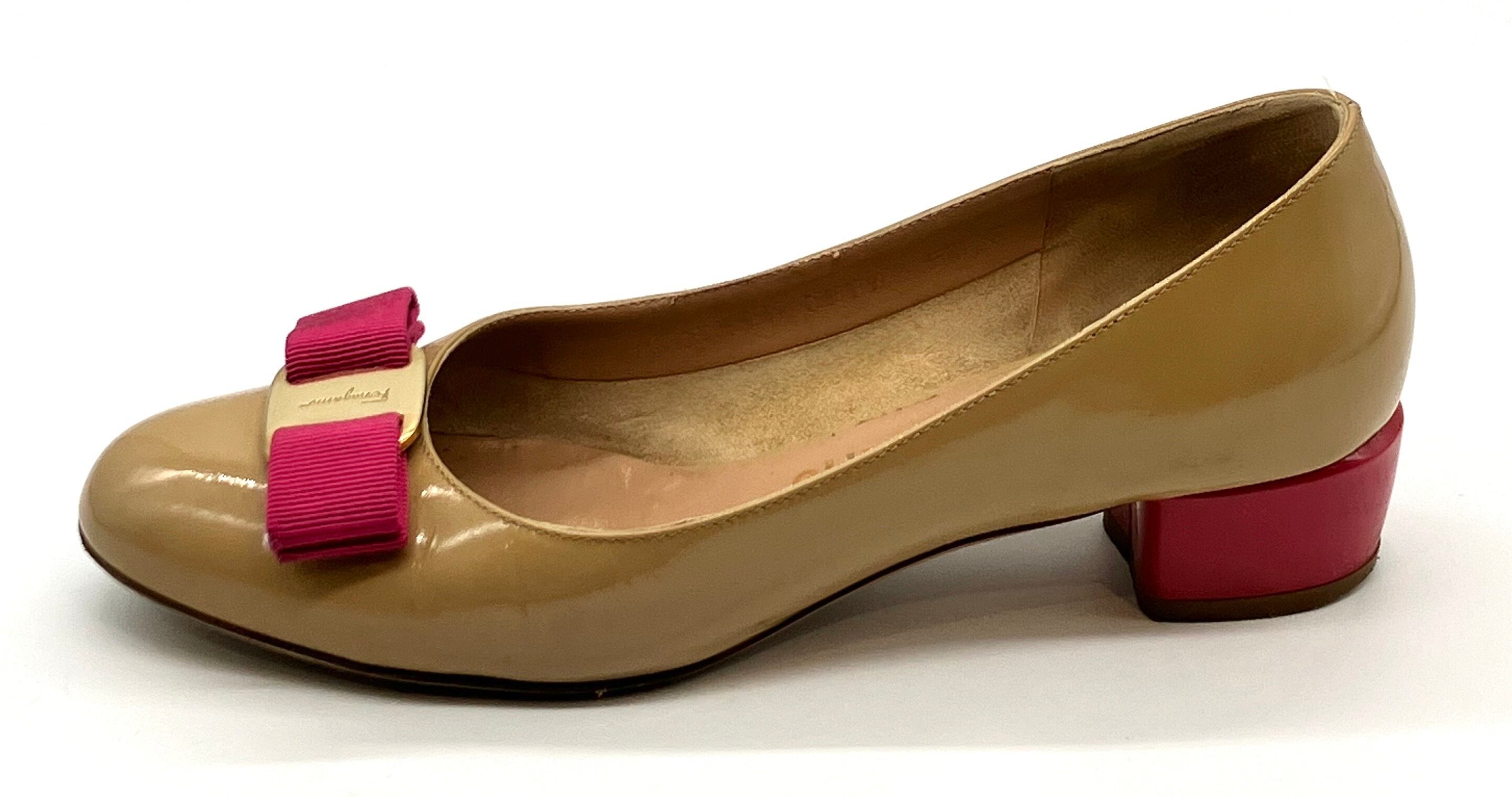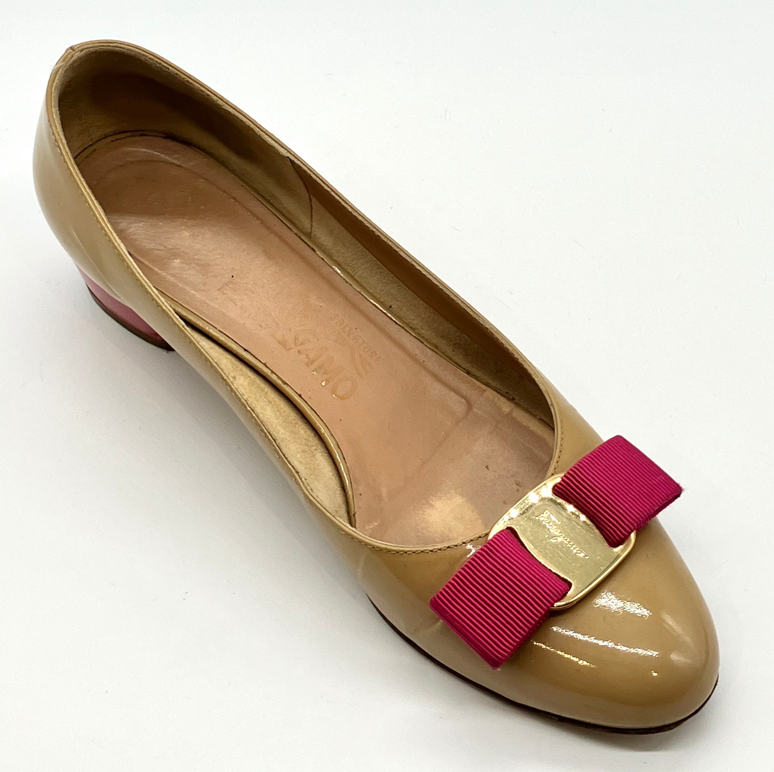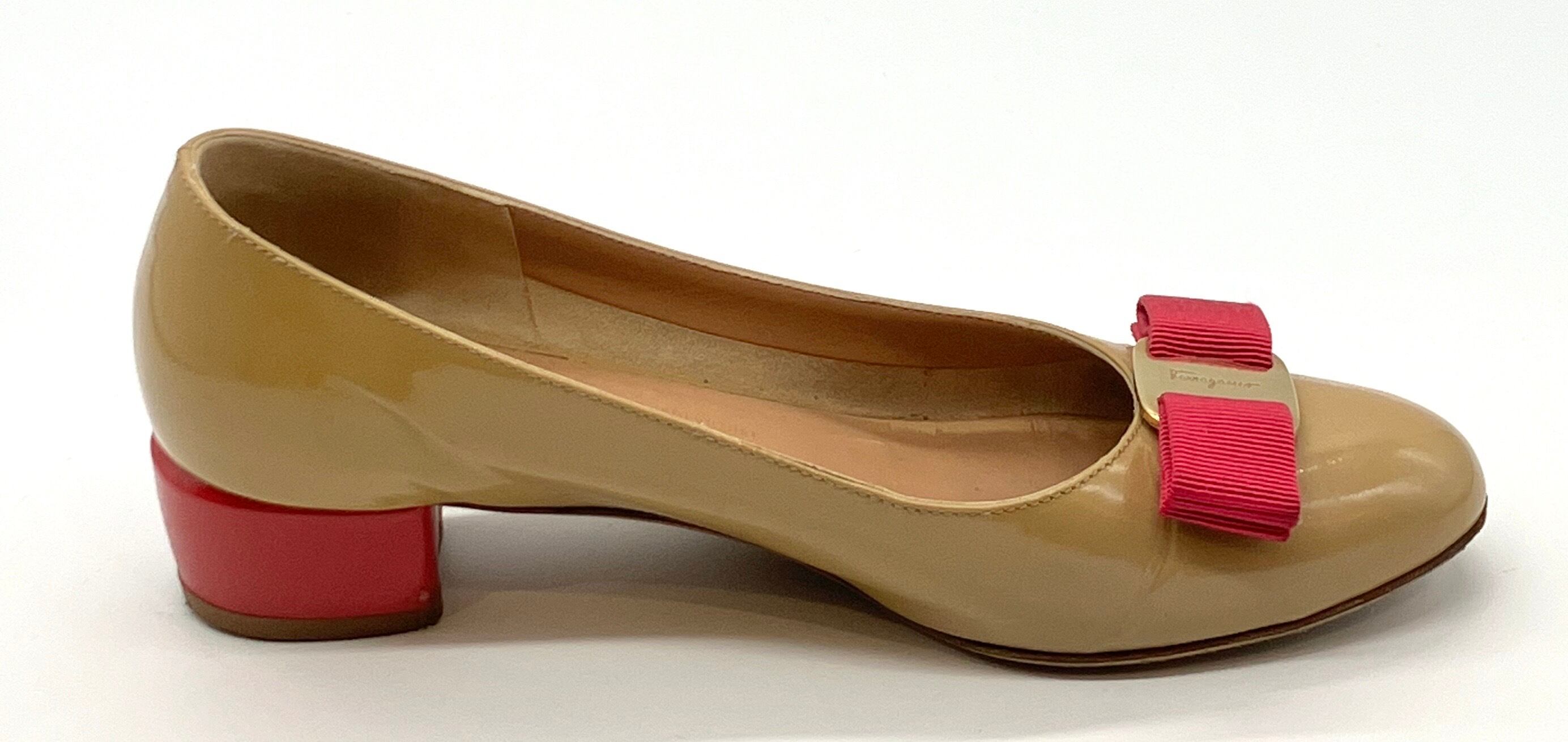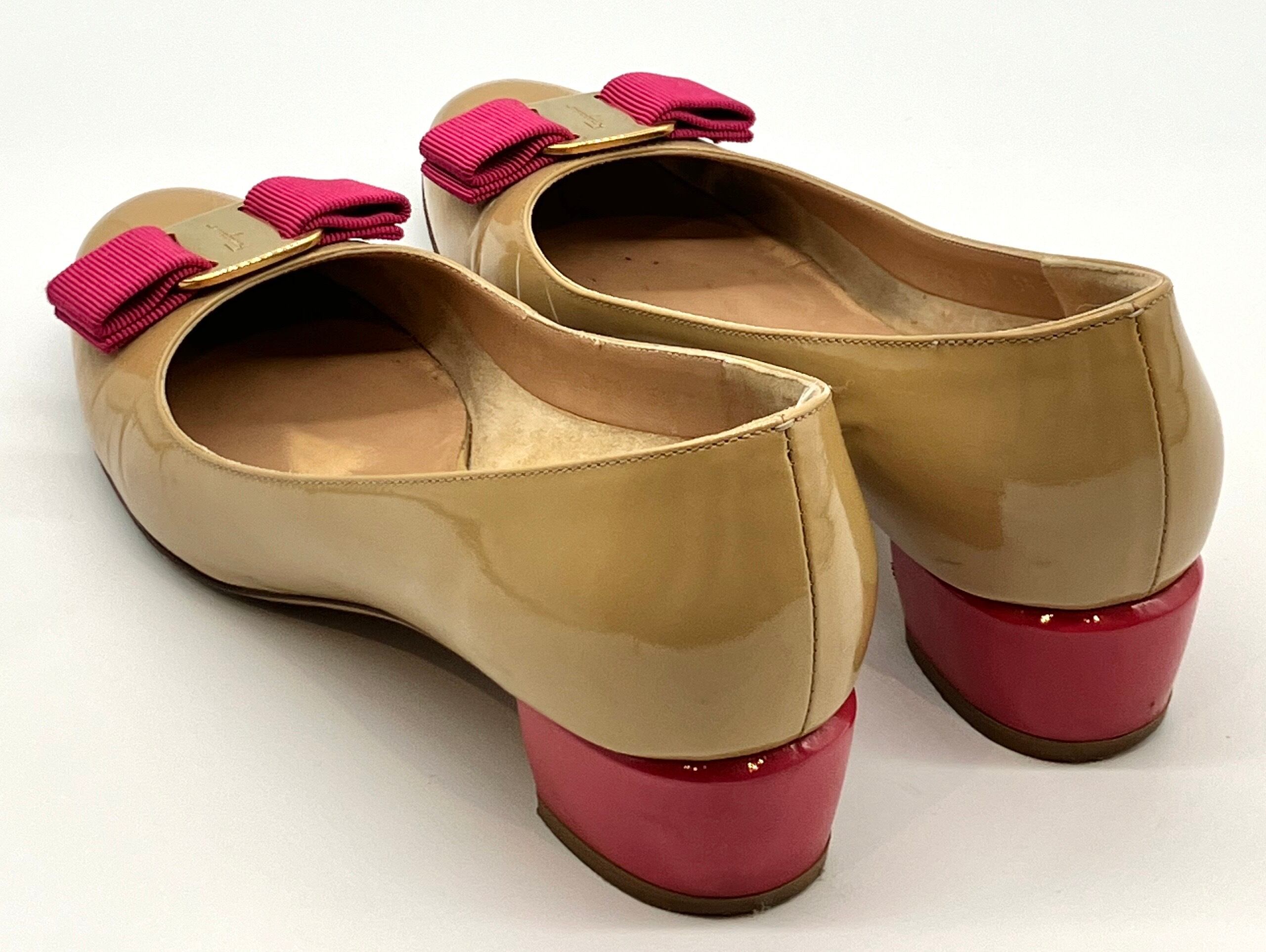 OLD FERRAGAMO(オールドフェラガモ) ベージュパテントレザー×ピンクヴァラリボンパンプス 5 1/2C