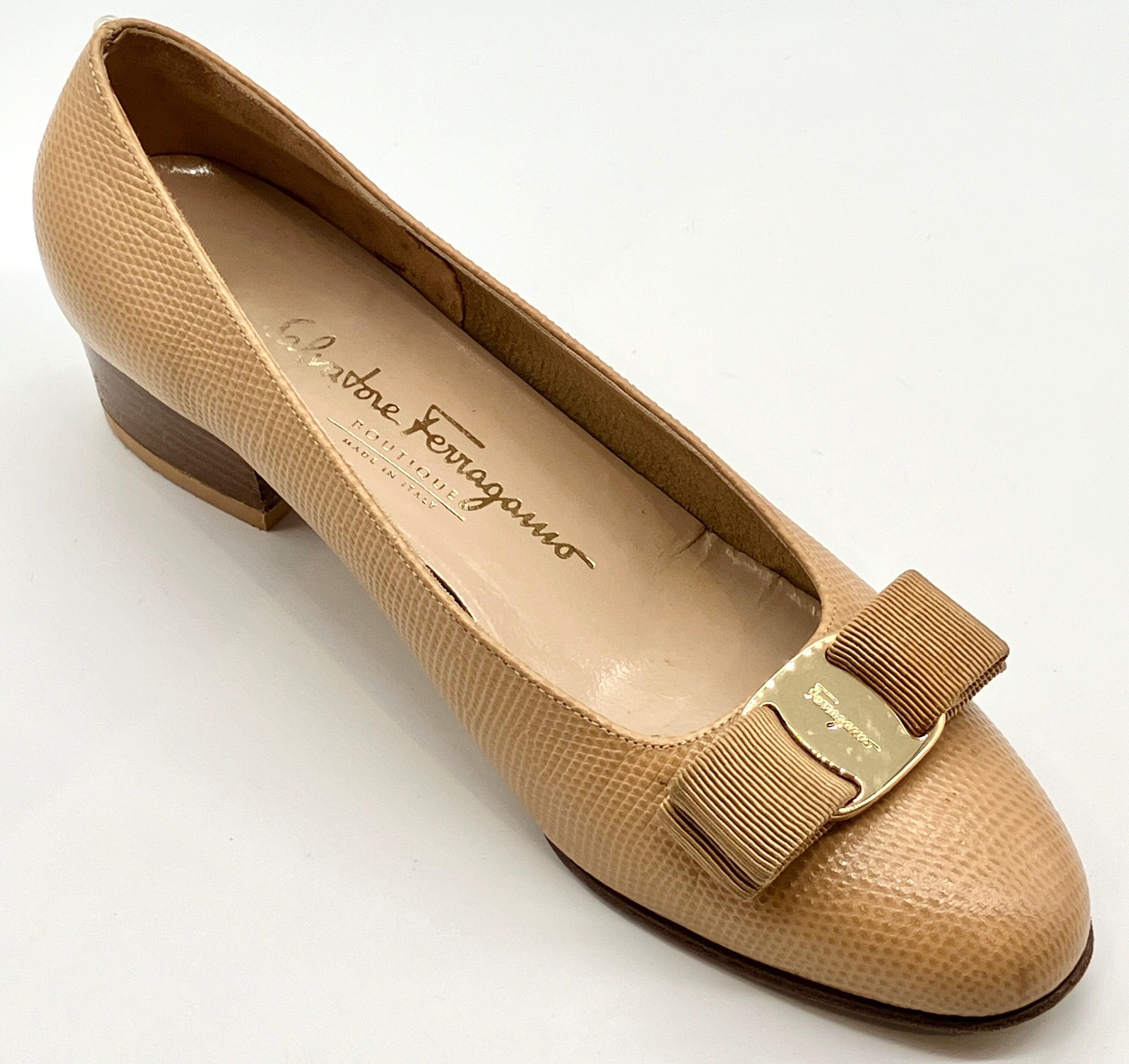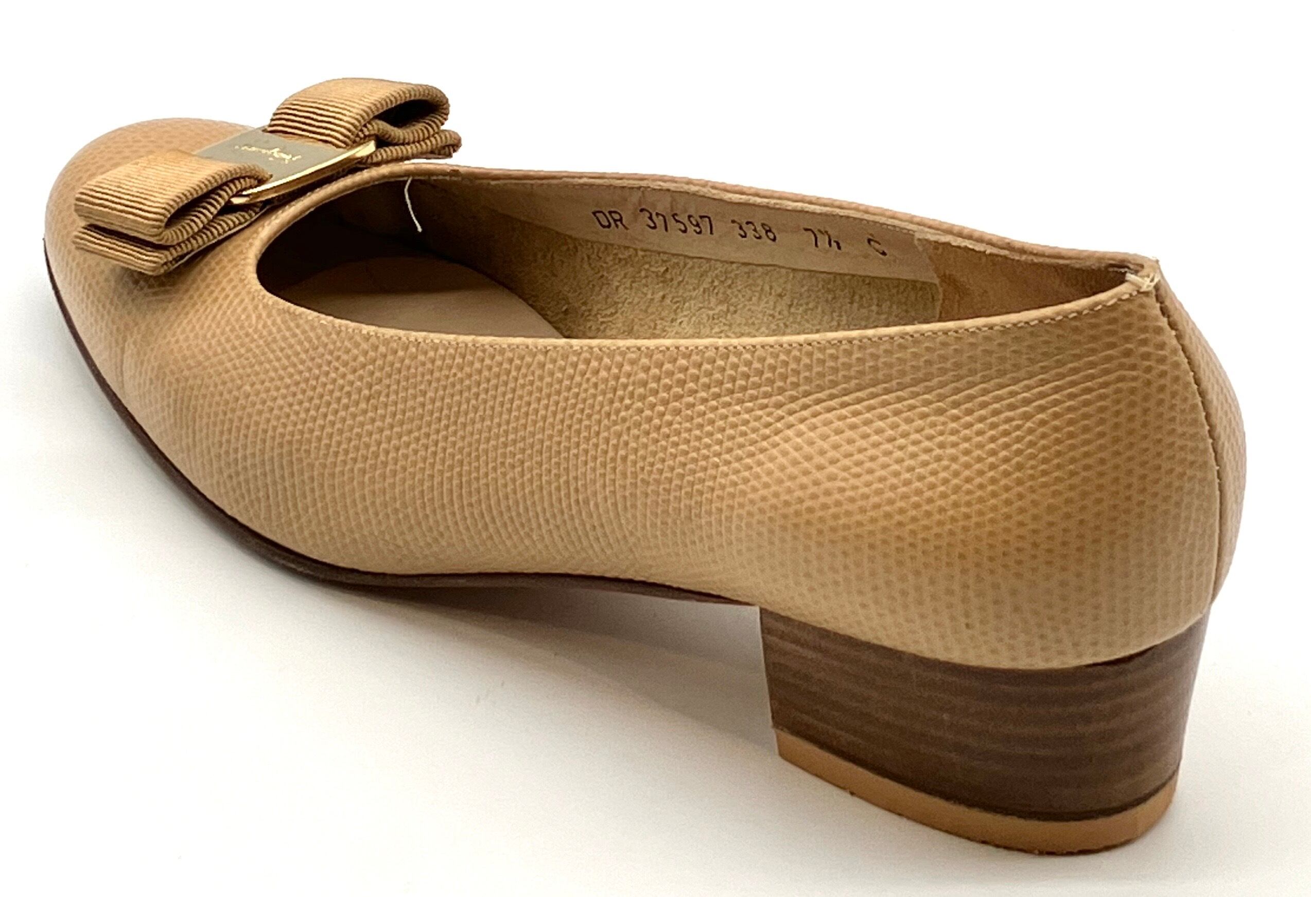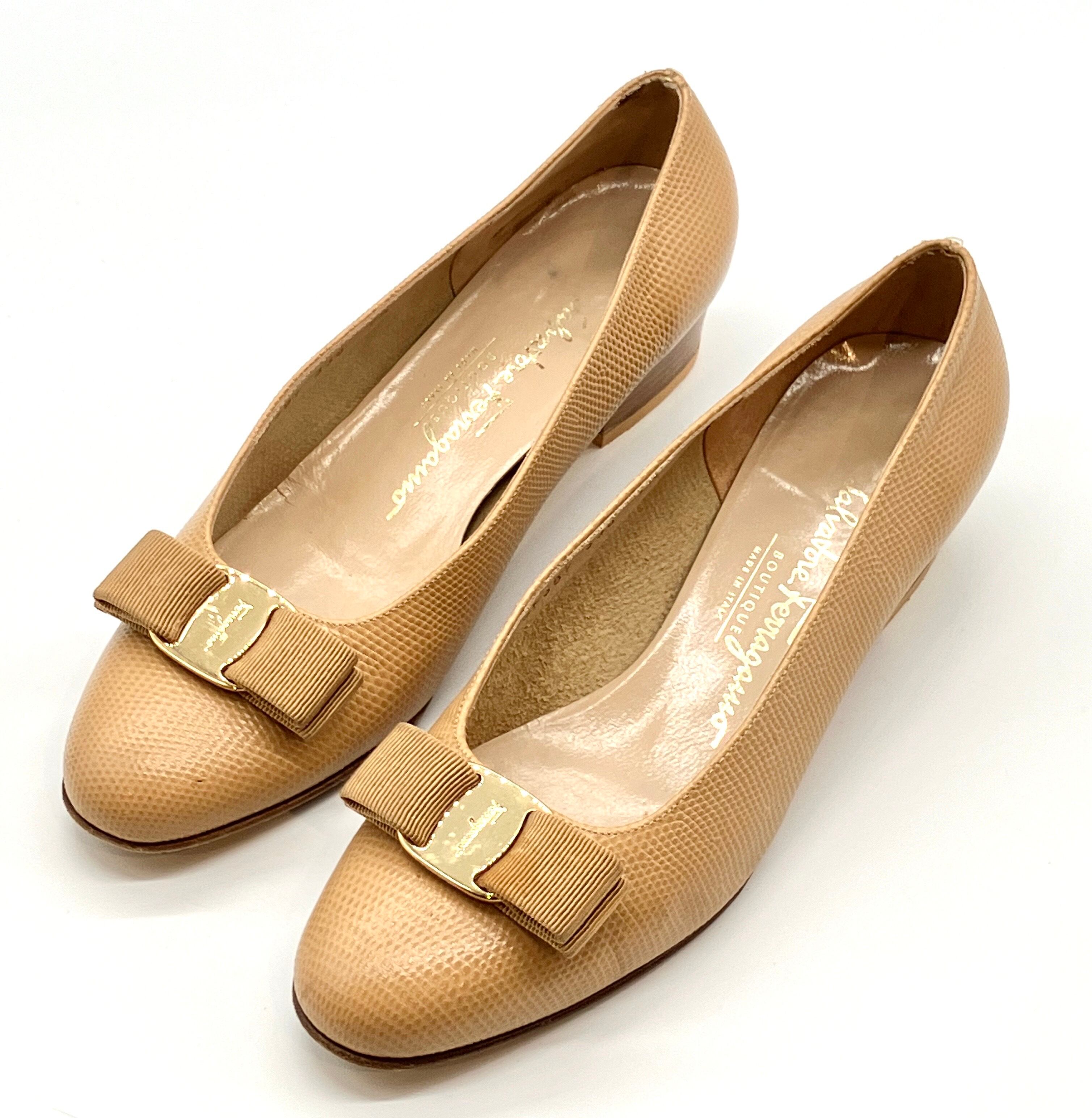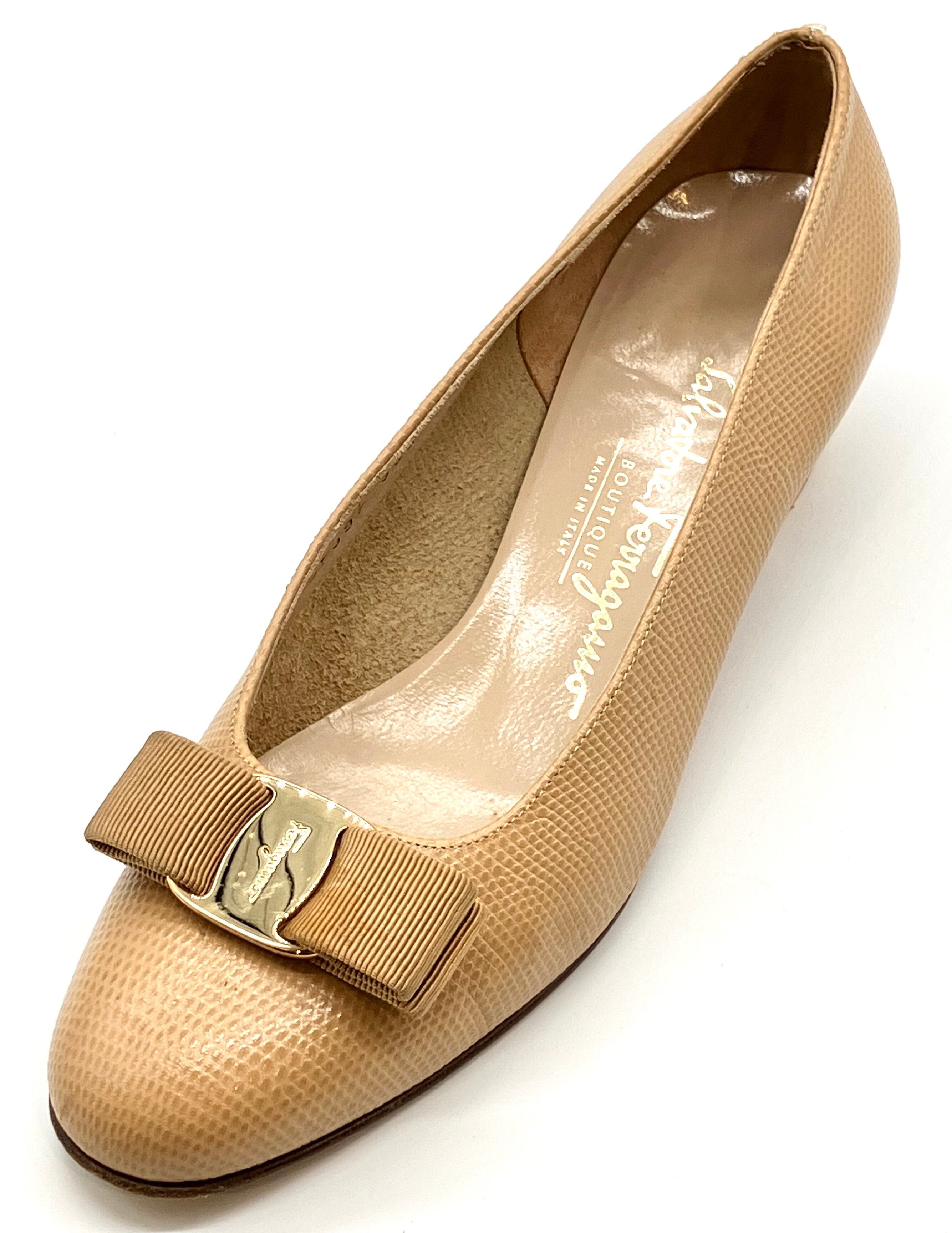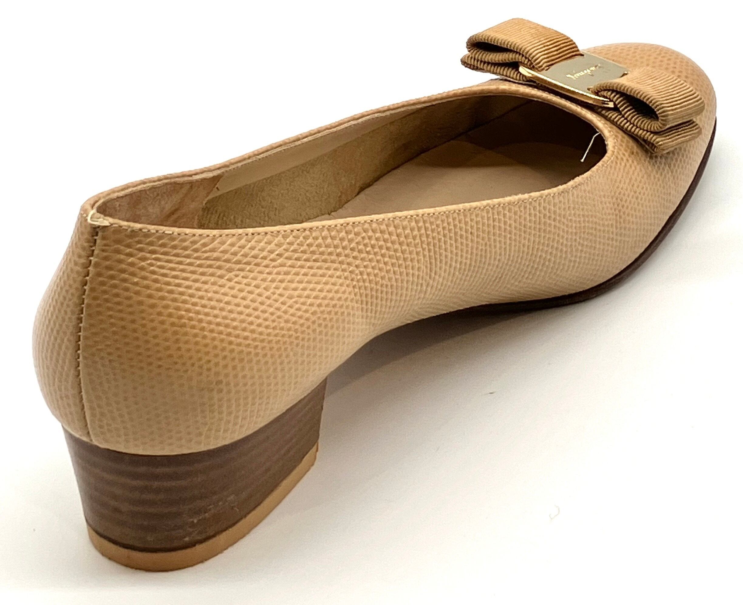 OLD FERRAGAMO(オールドフェラガモ) ベージュ型押しレザーヴァラリボンパンプス 7 1/2C